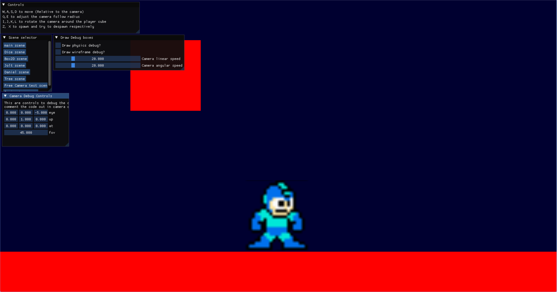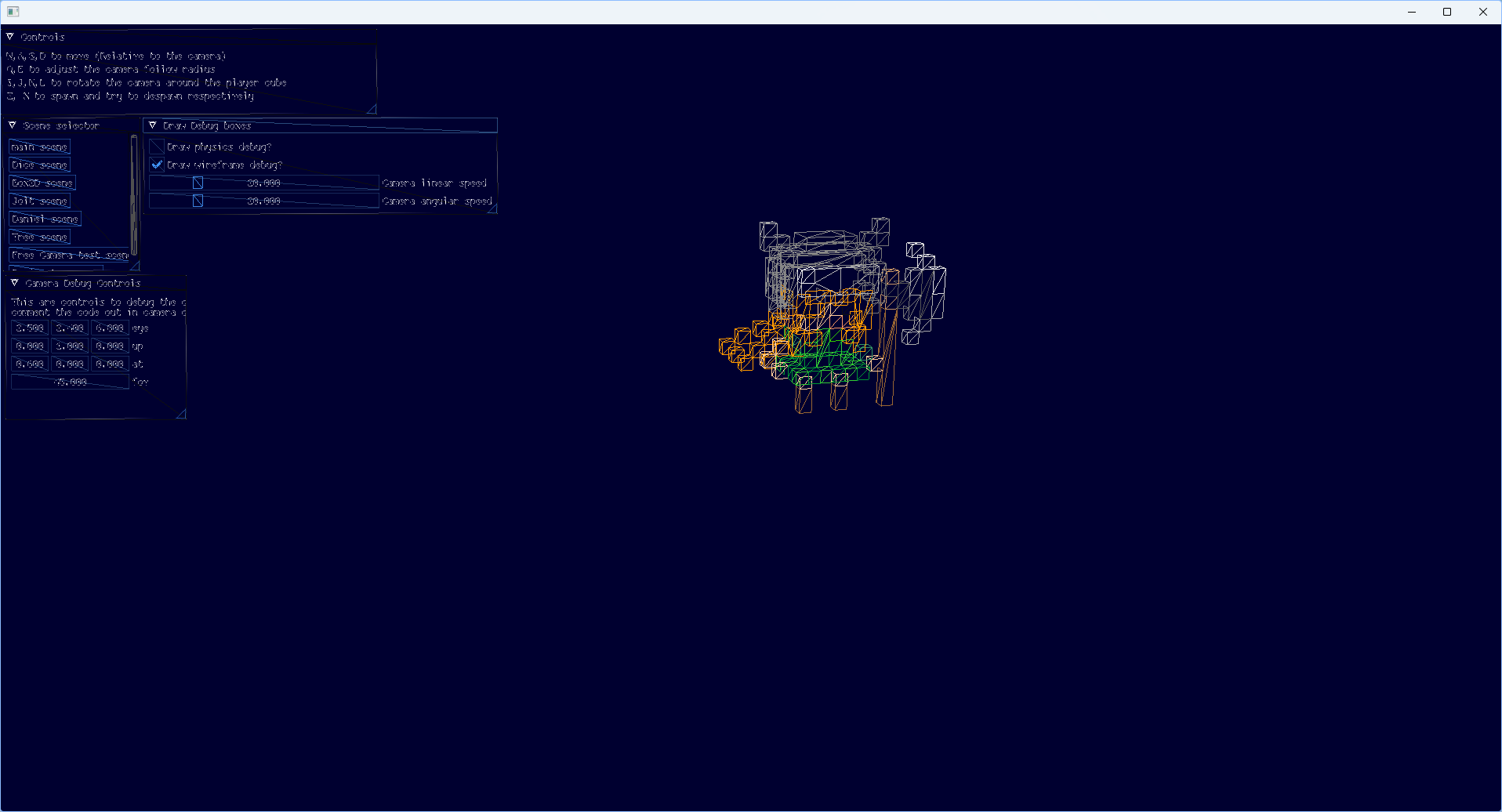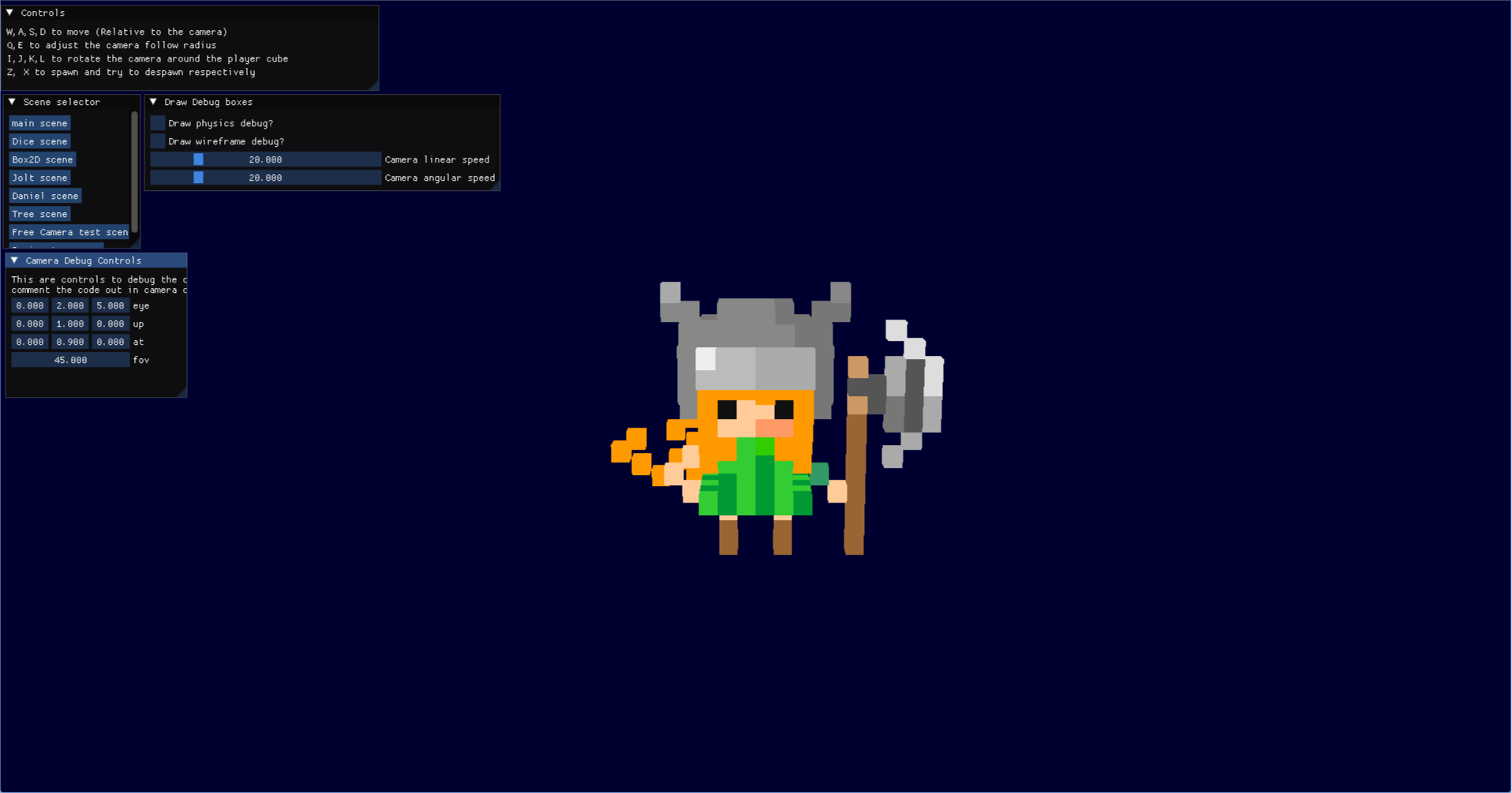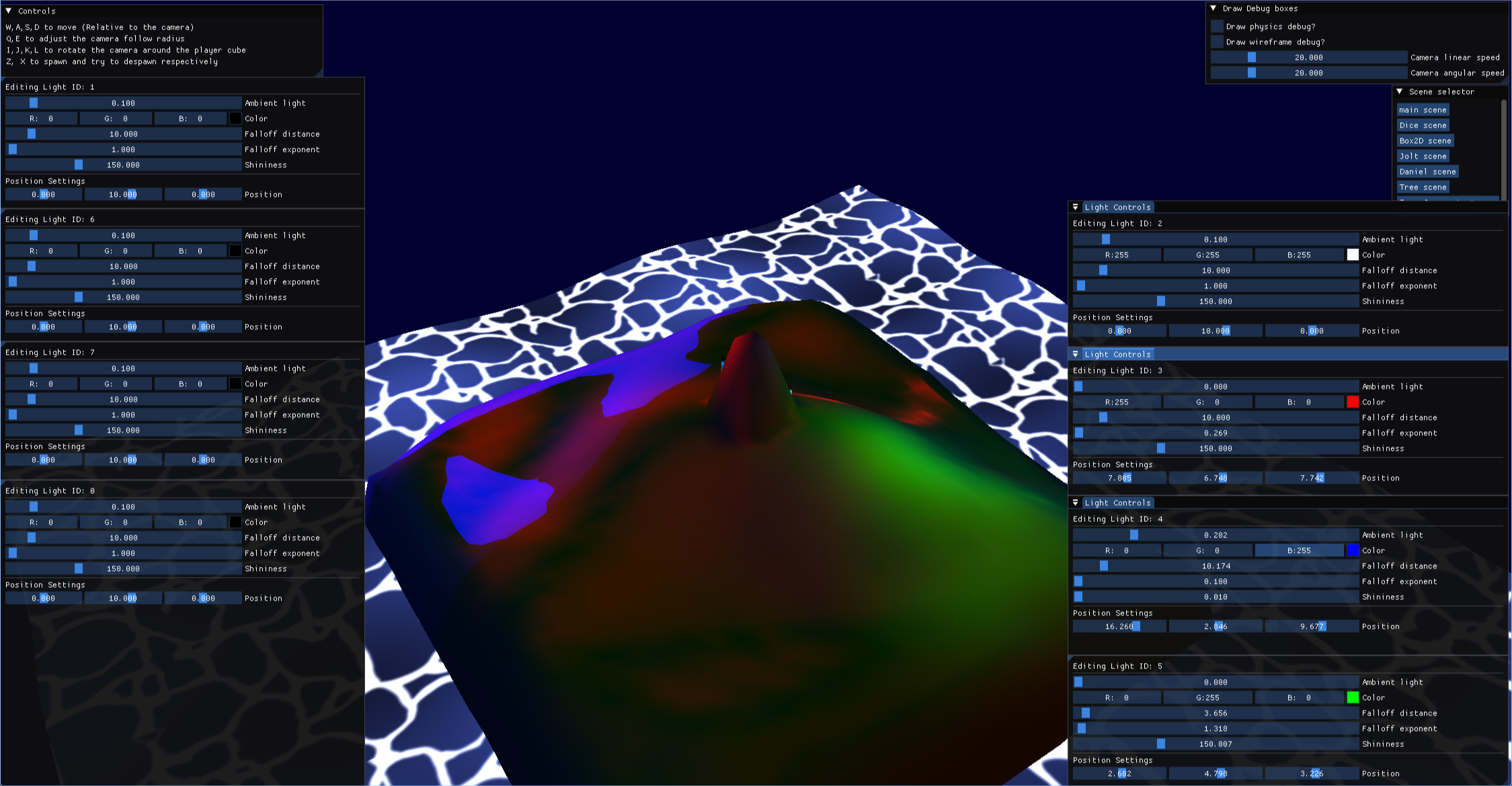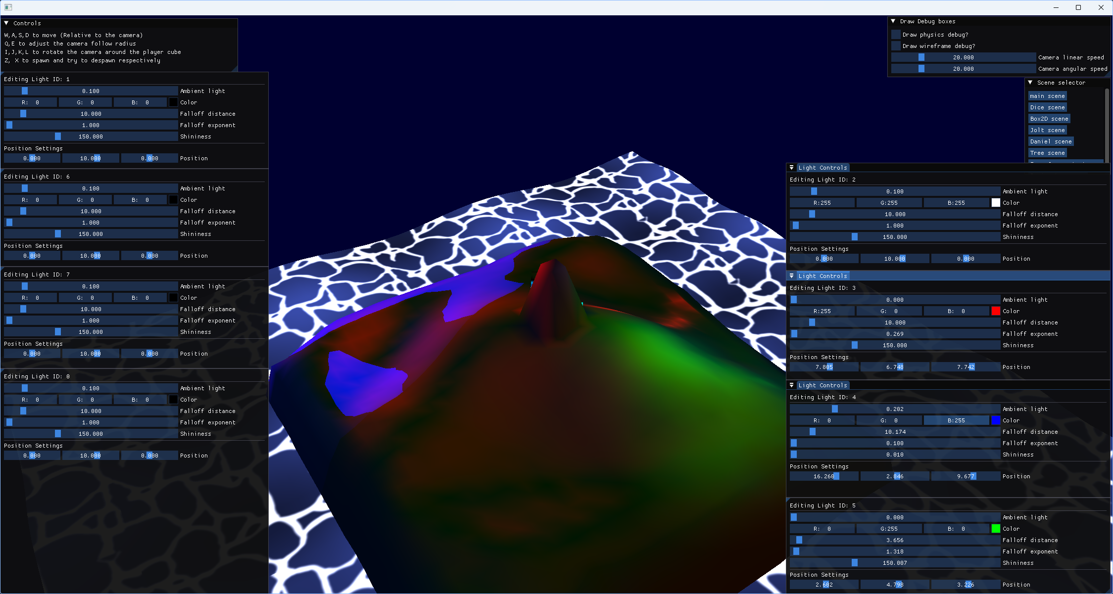I wrote this engine for one of my graphics class. It uses OpenGL for the graphics, ImGUI for the UI and flecs for most of the internal mechanisms.